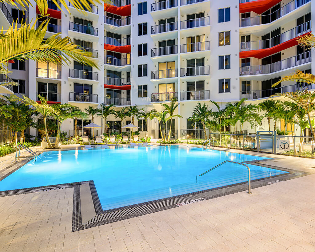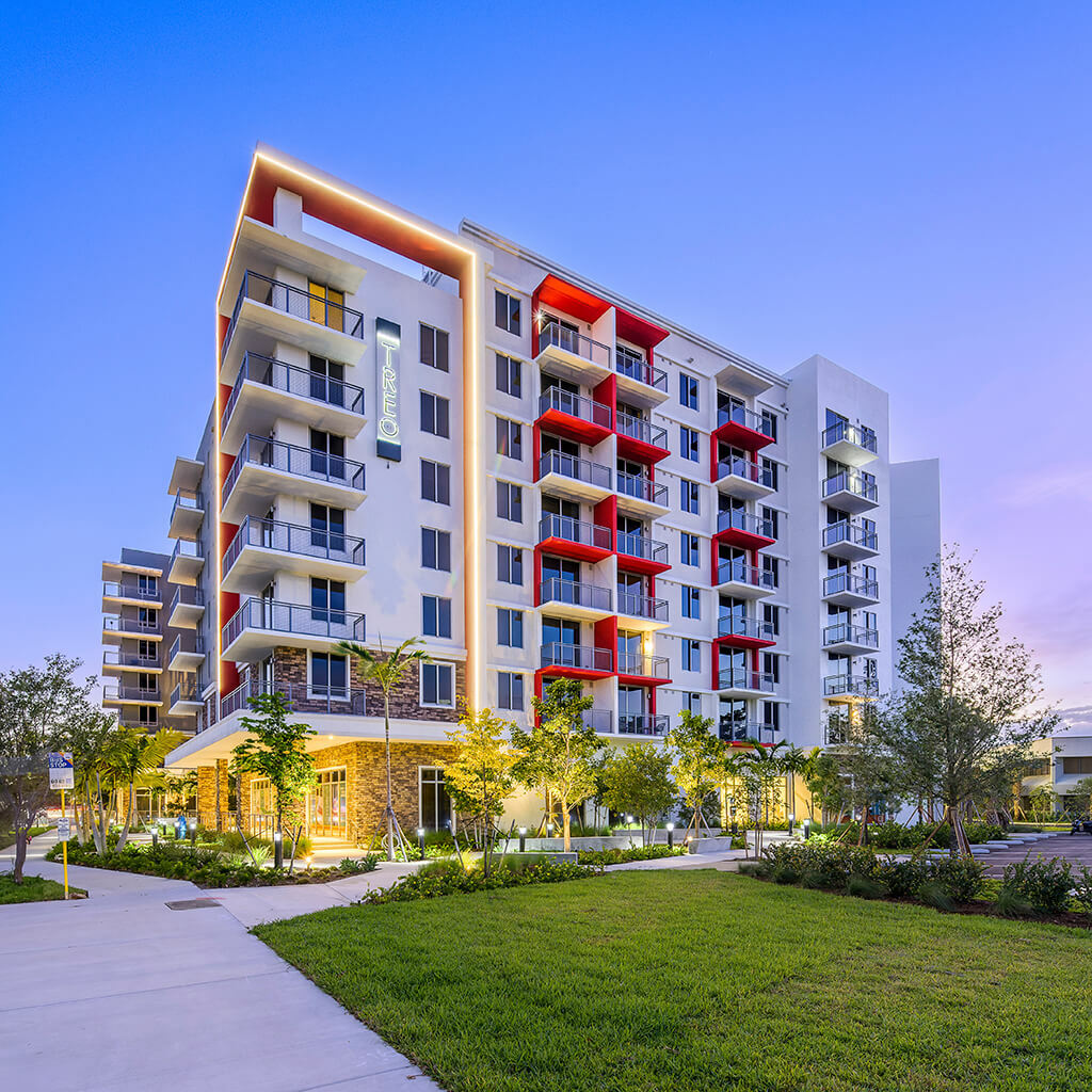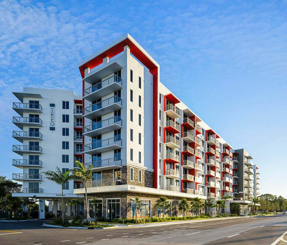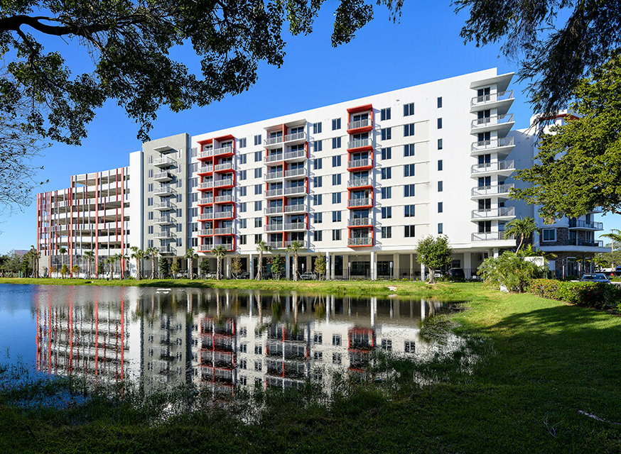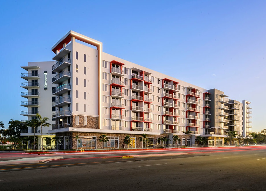 A mixed-use development on a 4.3-acre property that includes an 8-story building with 295 units of rental apartments, 9,200 SF of ground-floor retail, and an attached 8-level parking garage.
